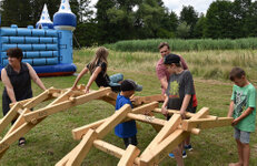 Dort angekommen, erwartete die Kinder schon das nächste Abenteuer: der Bau der Leonardo-Brücke. Aber wie sollte das ohne Schrauben, Nägel oder andere Befestigungsmöglichkeiten funktionieren? Die Abenteurer standen vor einem Rätsel, das sie sehr gut gemeinsam lösten. Wer Lust hatte, konnte sich von Marie und Alina schminken lassen oder in Origamitechnik Tauben, Hühner und Kaninchen falten.