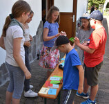 Pünktlich um 10.00 Uhr kamen 15 Kinder und Jugendliche. Bei bestem Wetter starteten wir das Abenteuer. Mit einem Kennenlernspiel und dem Fröbelturm ging es los. Anschließend folgte ein Quiz. Es galt Fragen zu Kaninchen, Geflügel und Tauben zu beantworten. Nach der Vesperpause und vielen Sprüngen auf der Hüpfburg machten wir einen Abenteuerspaziergang zum Kleintierzuchtverein Bilfingen. Unterwegs wurden Kräuter, die dem Wohl der Tiere dienen, gesucht und bestimmt. Dabei half uns das Buch „Kaninchen-Apotheke“. In Bilfingen angekommen trafen wir auf Züchter Roland, der den Kindern und Jugendlichen frisch geschlüpfte Küken zeigte, mit ihnen Wachteleier suchte und allerlei Fragen geduldig beantwortete. Spannend waren die grünen Eier der Rasse Grünleger, die nicht mit Farben gefärbt wurden, sondern von Natur aus grün sind. Gemeinsam mit Roland wurden die Tiere gefüttert und dann ging es zurück nach Ersingen.